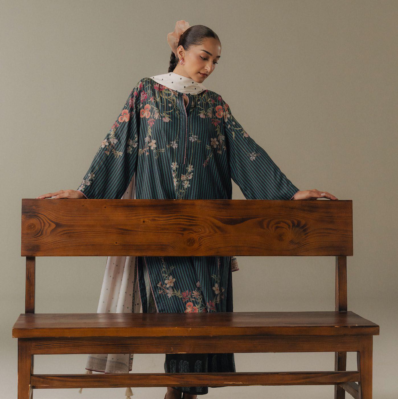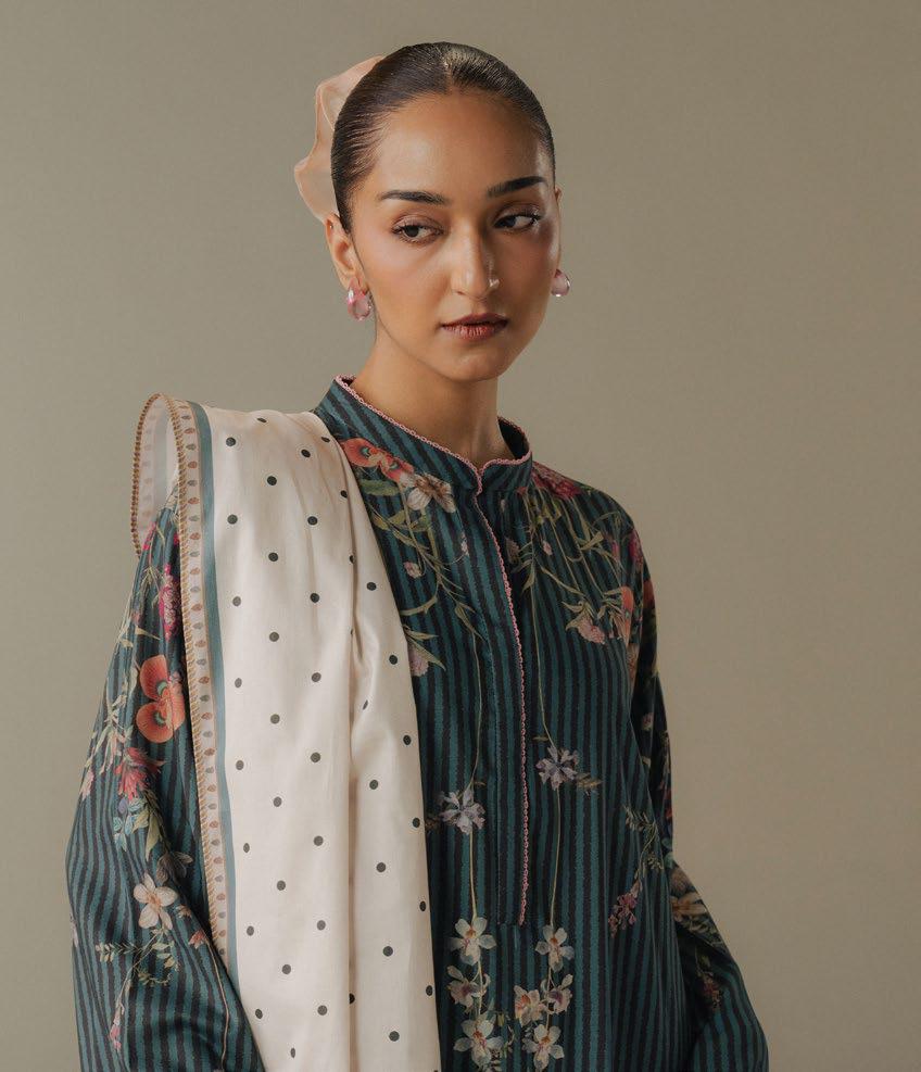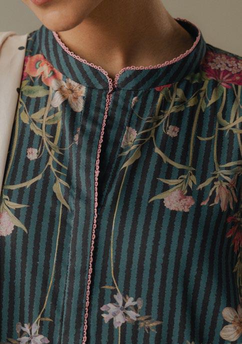 180.00A teal and gray striped shirt inspired by floral elements, paired with a soft gray trouser