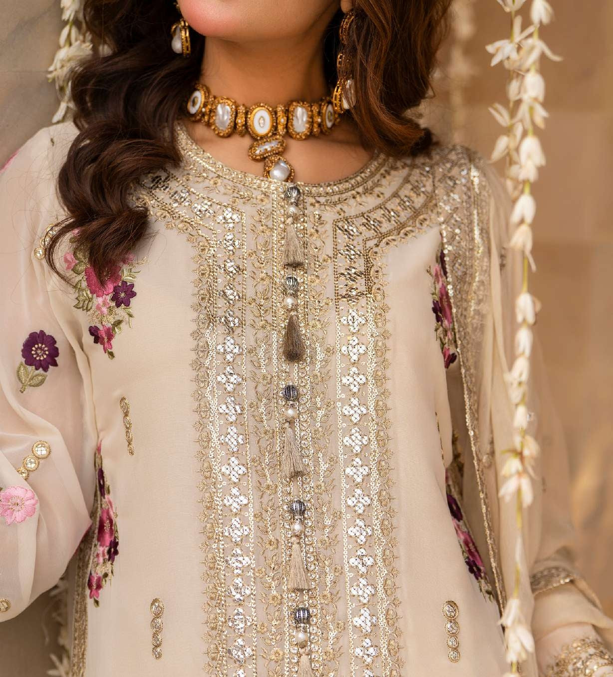 Exude timeless sophistication with Arezou Pearl, a graceful unstitched festive suit crafted in a soft pearl beige tone. The outfit is adorned with delicate floral embroidery and refined embellishments across the neckline, sleeves, and hem, creating a look that is both subtle and luxurious.