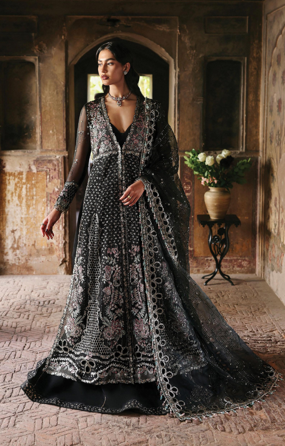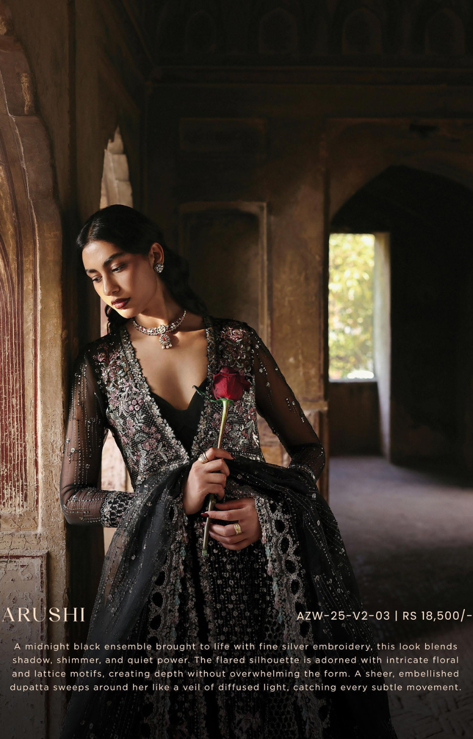 shadow, shimmer, and quiet power. The flared silhouette is adorned with intricate floral