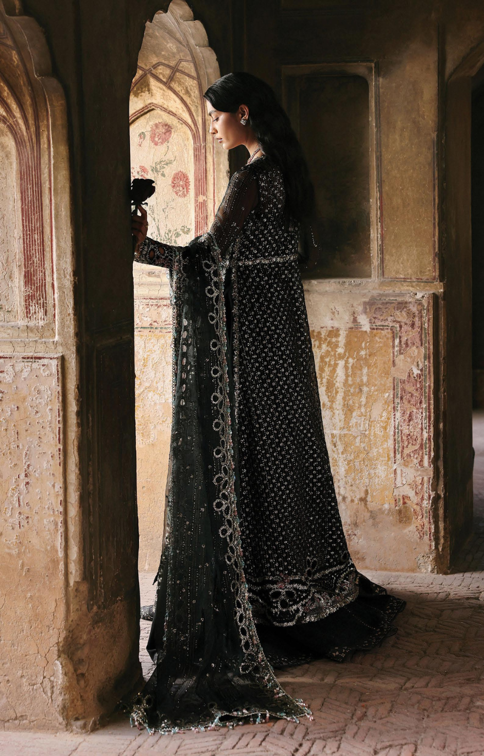 dupatta sweeps around her like a veil of diffused light, catching every subtle movement.