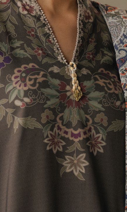 The look is complemented by a dusty pink shawl adorned with paisley-inspired motifs,