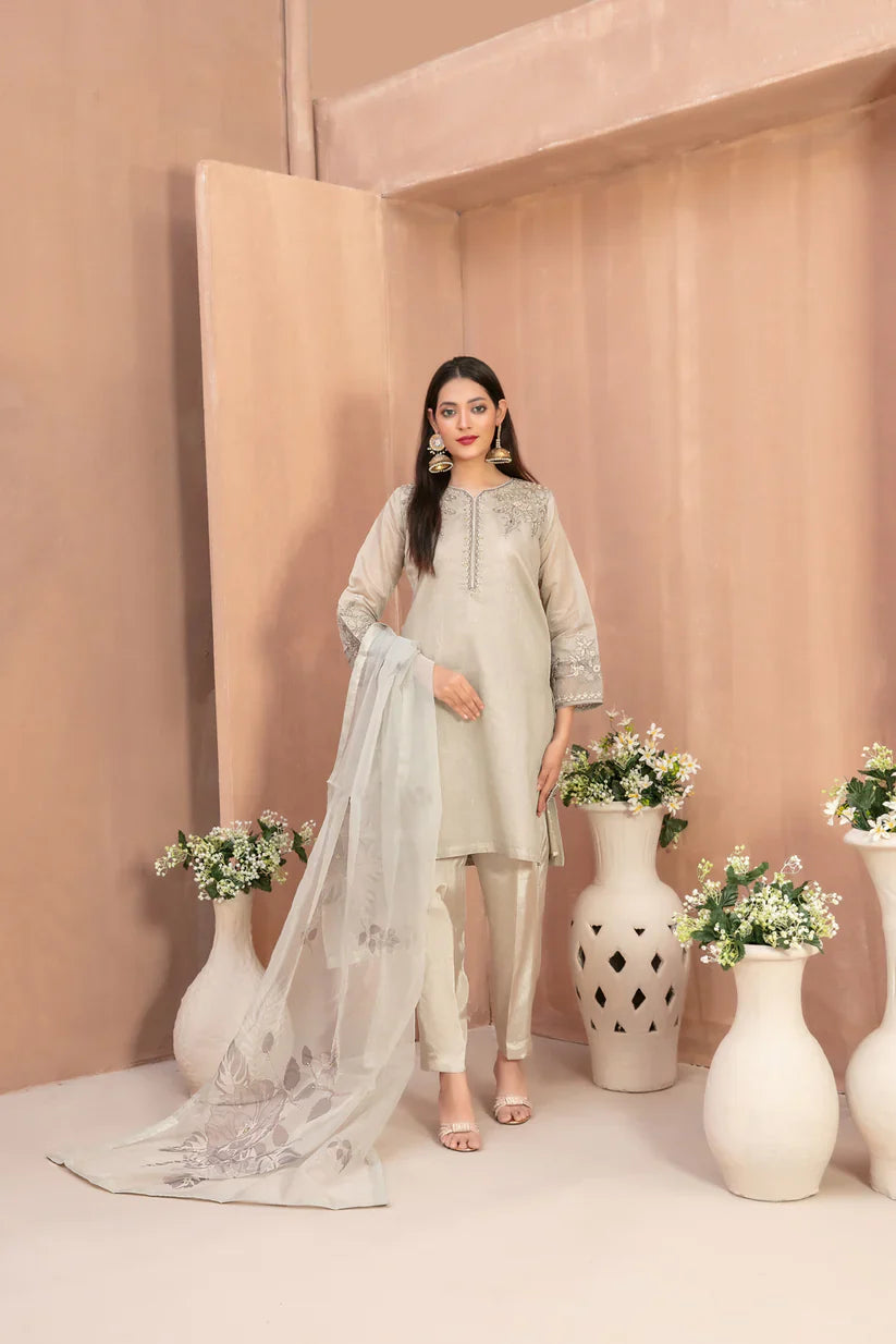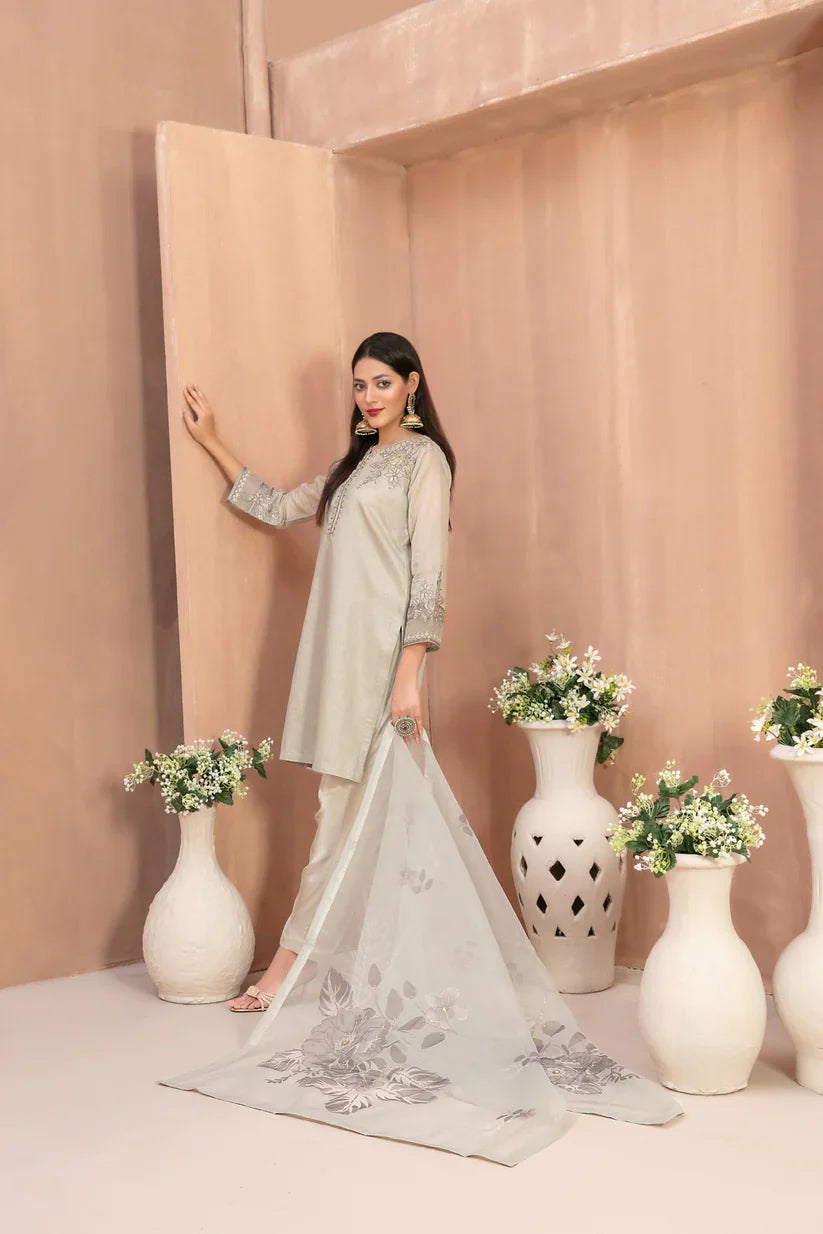 D-1806 Aleyla by Tawakkal Fabrics is an attractive and elegant 3-piece stitched outfit from the Embroidered Khadi Collection 2026. Featuring a beautifully embroidered khadi shirt with refined embellishments, paired with a digitally printed organza dupatta and a stitched grip viscose trouser, this ensemble is perfect for graceful and sophisticated styling.