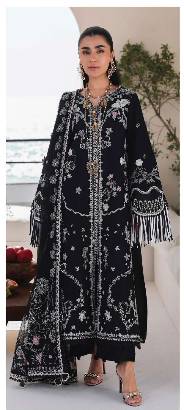 Shirt Brand: QALAMKAR Designer: Sahil Collection: Luxury LIANA Embroidered Front Embroidered Front Motifs (Left & Right) Handcrafted 3D Floral Embellishments Embroidered Neckline Plain Back Embroidered Sleeves Embroidered Sleeves Border Dupatta...