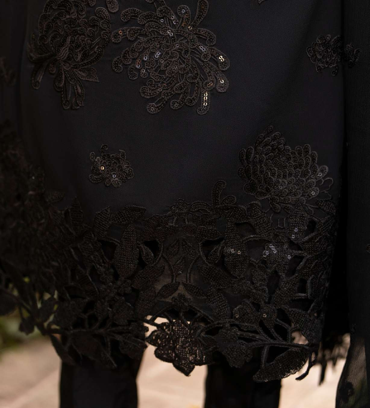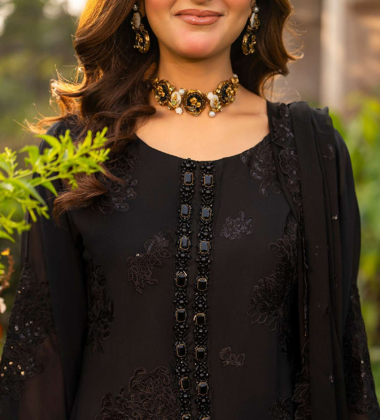 Designed with flowing sleeves and a graceful silhouette, the ensemble is paired with tailored trousers and a sheer embroidered dupatta that adds softness and movement to the look. The monochrome black palette enhances the outfit’s versatility, making it a wardrobe essential for elevated occasions.