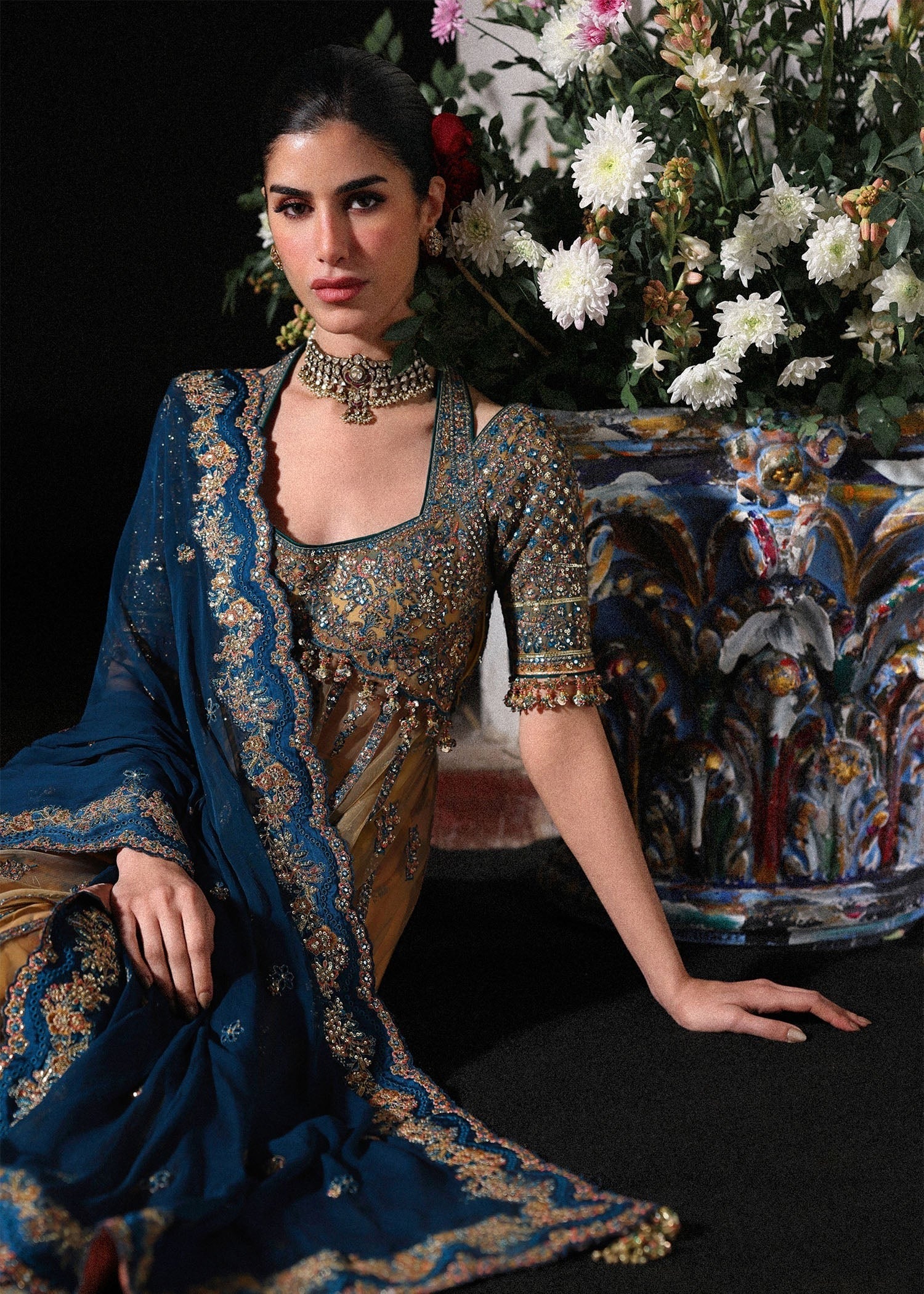This exquisite ensemble showcases a meticulously crafted pishwas featuring embroidered net panels with embroidered daman border and embroidered sleeves that create a fluid, graceful silhouette with refined detailing. Paired with...