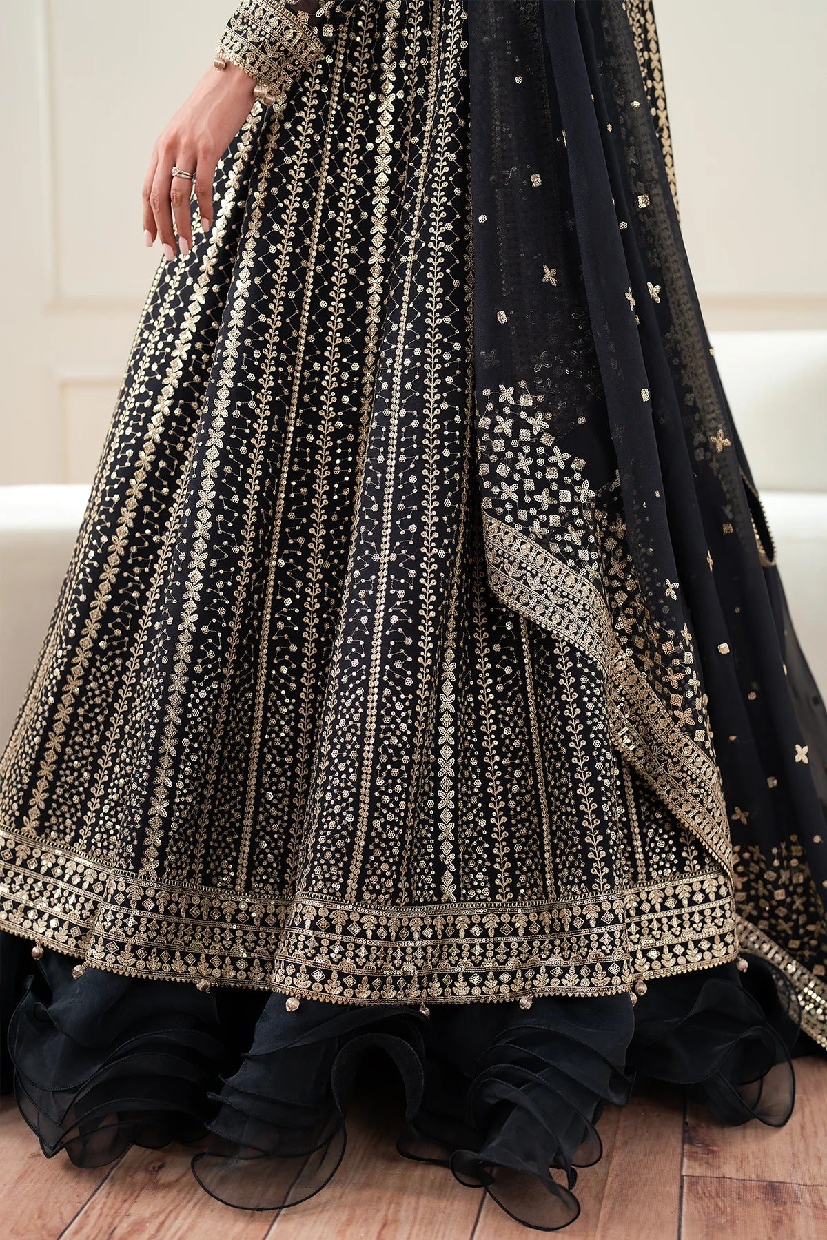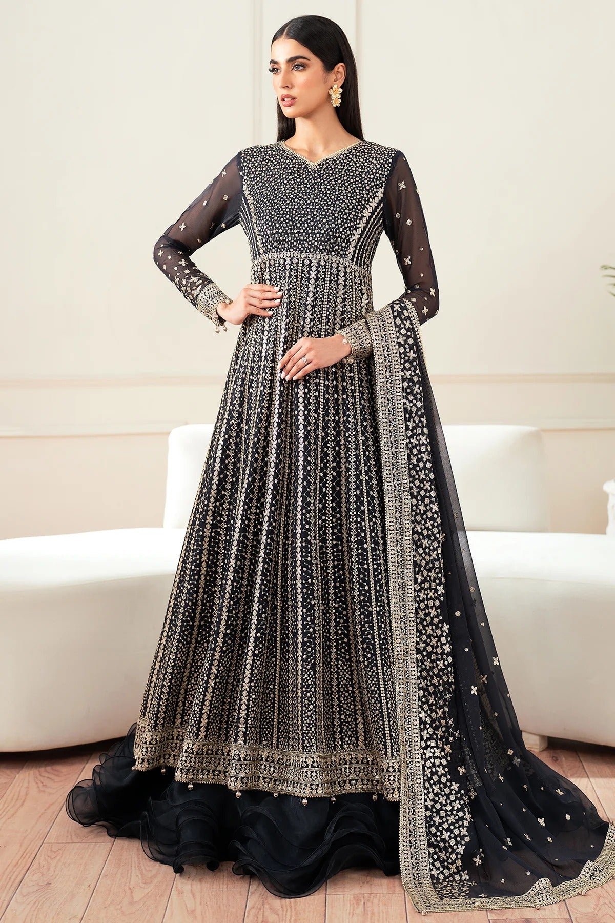 DRAPED IN DARK NAVY GOLDEN SEQUINS GLISTENDELICATE SHIMMERS DANCES ACROSS THE FABRICSHIMMERING & STRIKING,CASTING A SPLENDID SPELLEmbroidered Chiffon Front & Back BodiceEmbroidered Chiffon Front & Back Panels (14)Embroidered Chiffon SleevesEmbroidered...