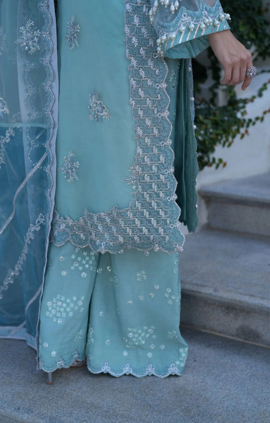 400.00MOONLIGHT DRAPES YOU IN SOFT SERENITY, A PALE AQUA CANVAS DETAILED WITH DELICATE