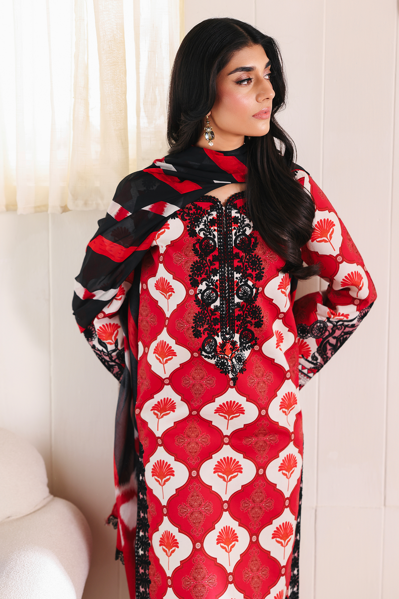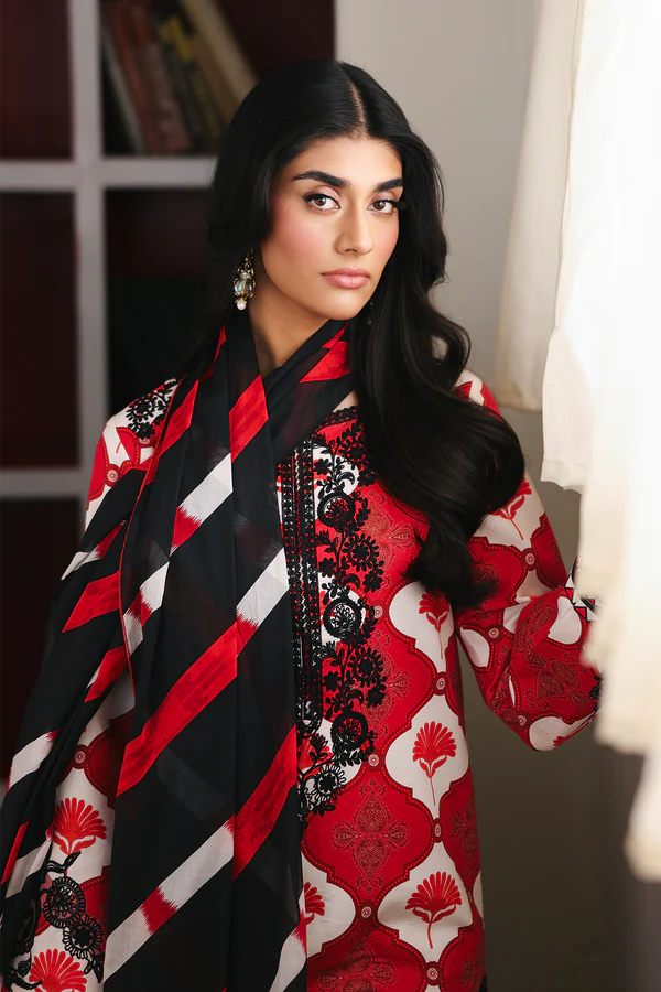 Delicate embroidered sleeve motifs and an embroidered hem border add intricate detailing, while embroidered lace on the sides enhances the silhouette with subtle sophistication. Paired with a digitally printed cotton trouser for breathable comfort and completed with a premium digitally printed voil dupatta, this ensemble is ideal for casual outings, daytime gatherings, and daily summer wear.