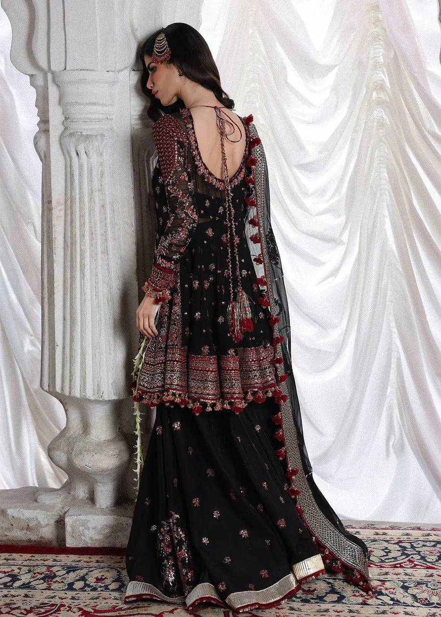 570.00This striking black ensemble is a statement of timeless sophistication and refined elegance. The embroidered peplum is beautifully detailed with intricate panels, creating a bold yet graceful look. It is paired with a gracefully flared embroidered sharara, adding volume and fluid movement to the silhouette. Completing the ensemble is a matching embroidered dupatta, adorned with delicate detailing and finished with four-sided borders for a rich, luxurious appeal. Perfect for festive celebrations and formal occasions, this outfit beautifully blends classic charm with contemporary style.
