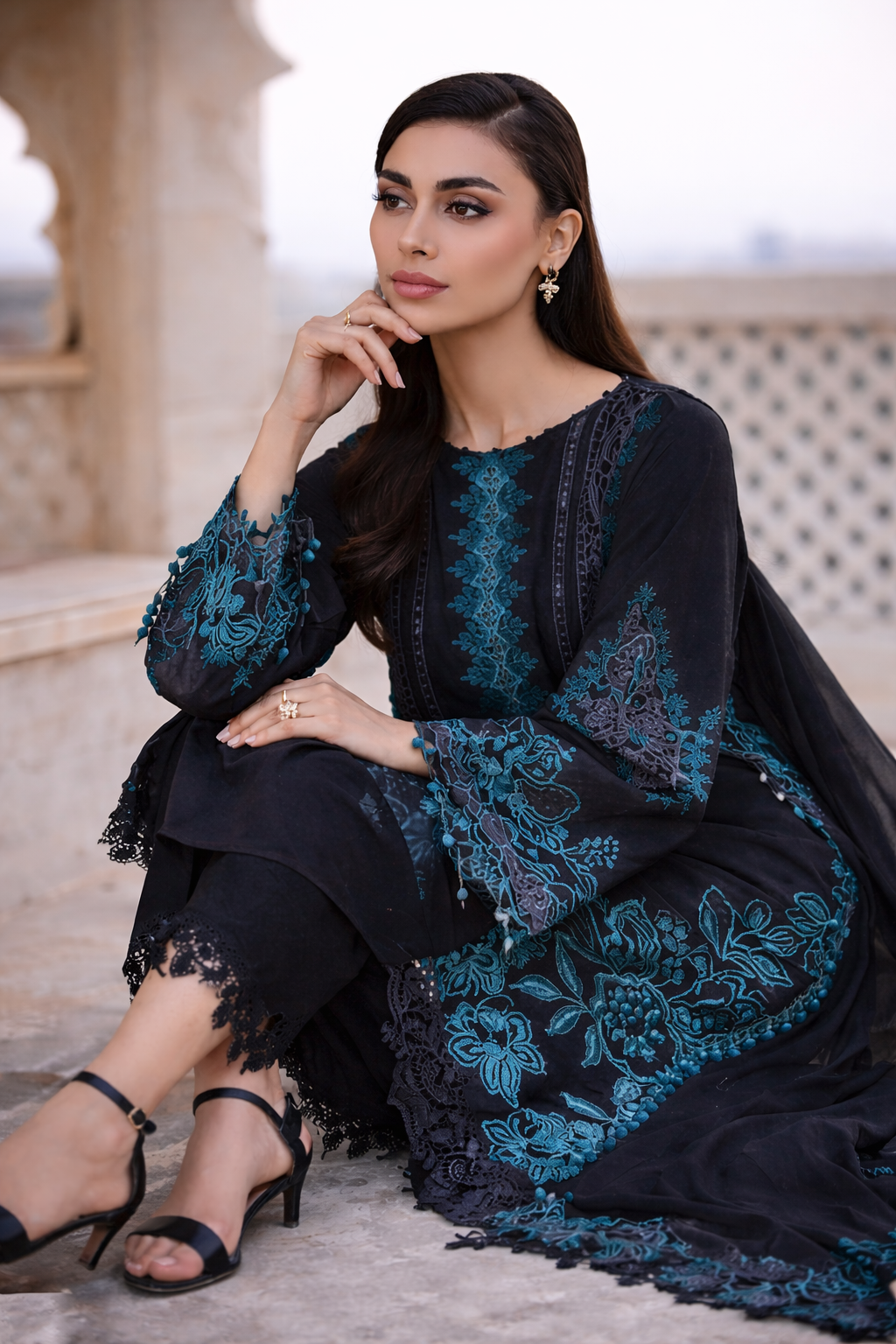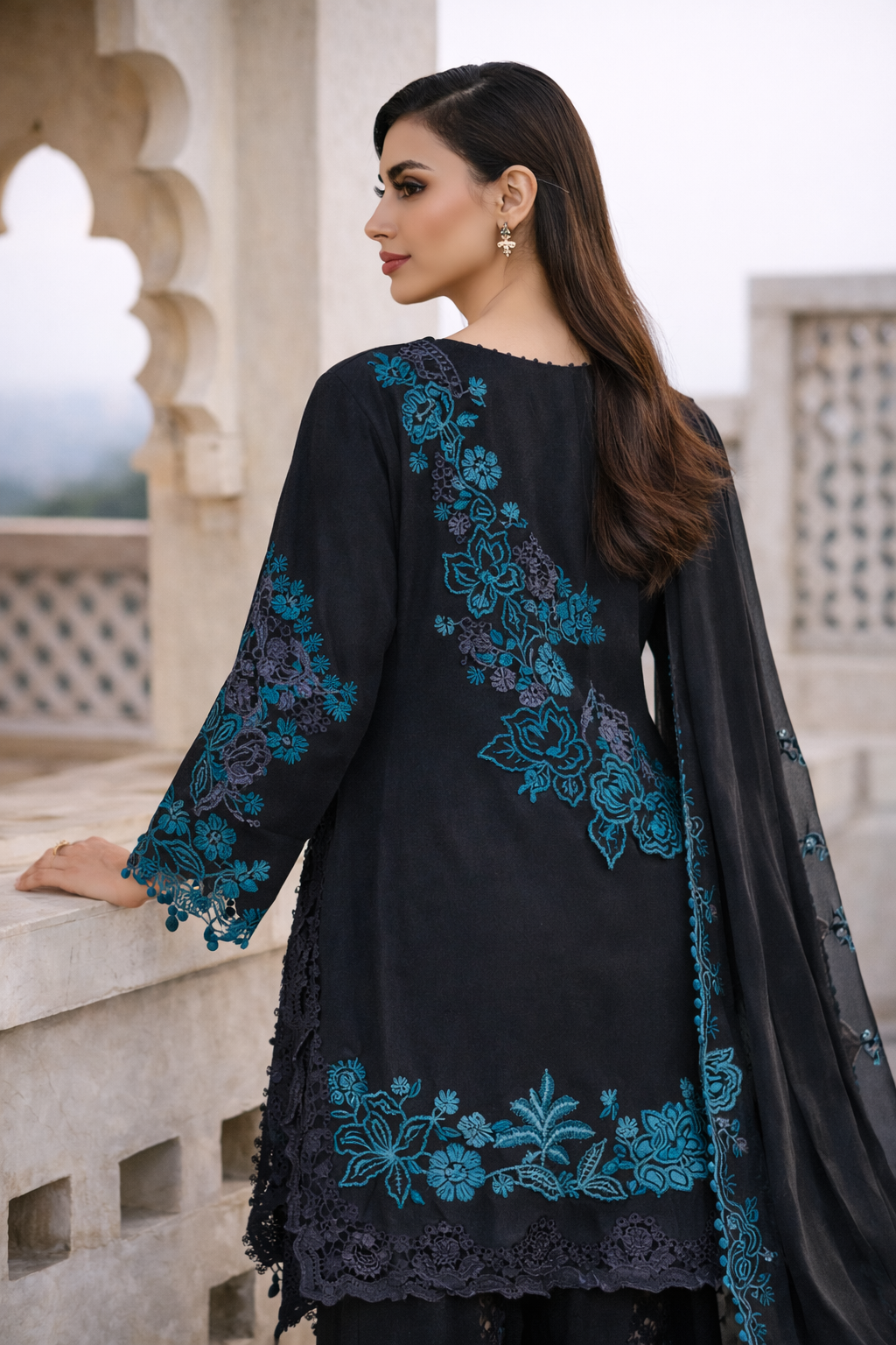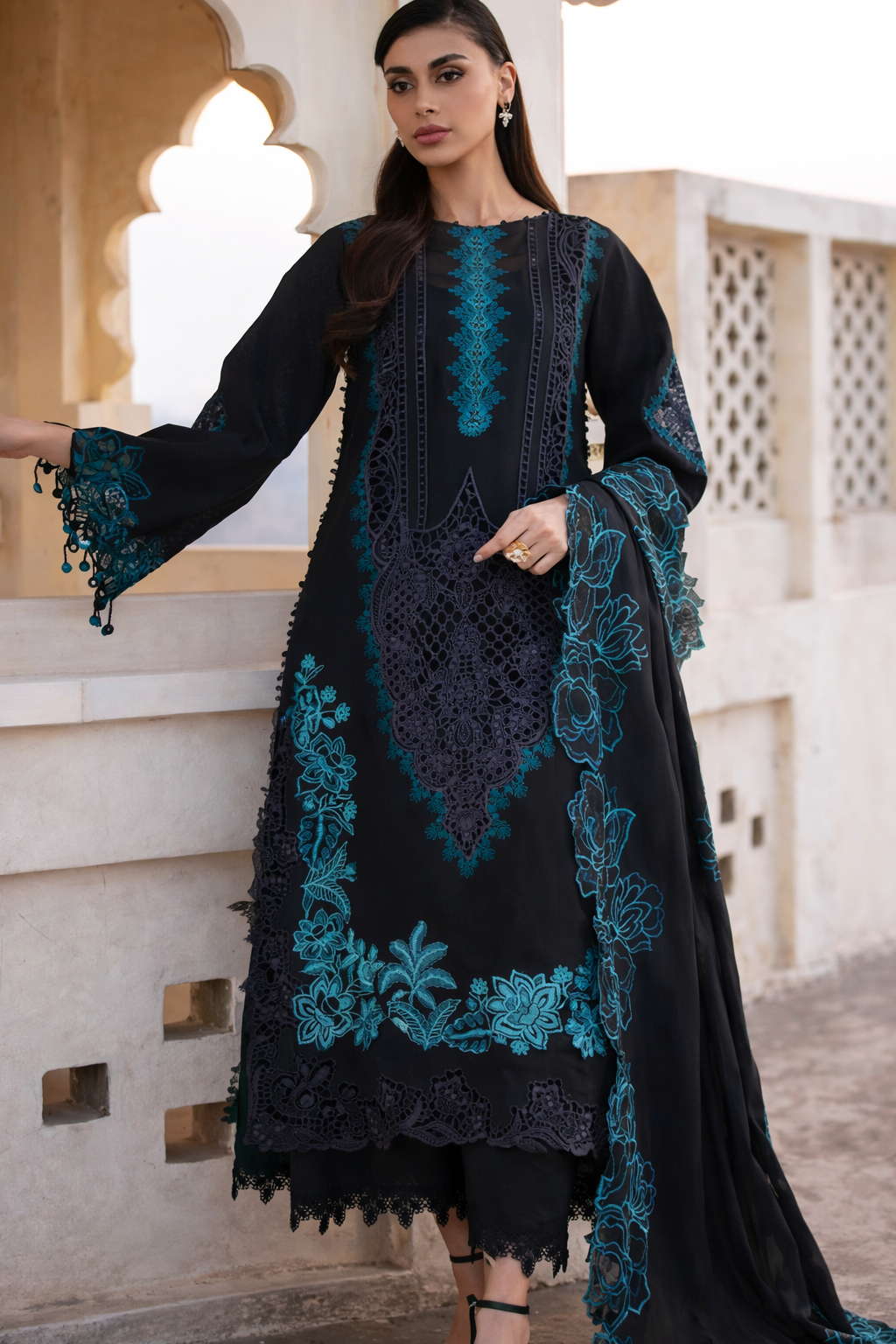 Embroidered Front Daman & Side Motif: 3 Pieces