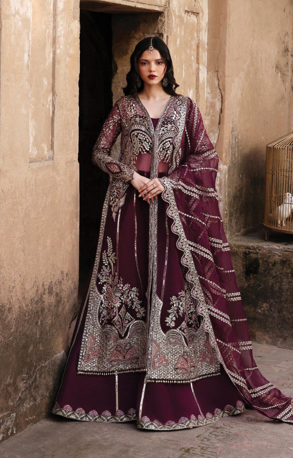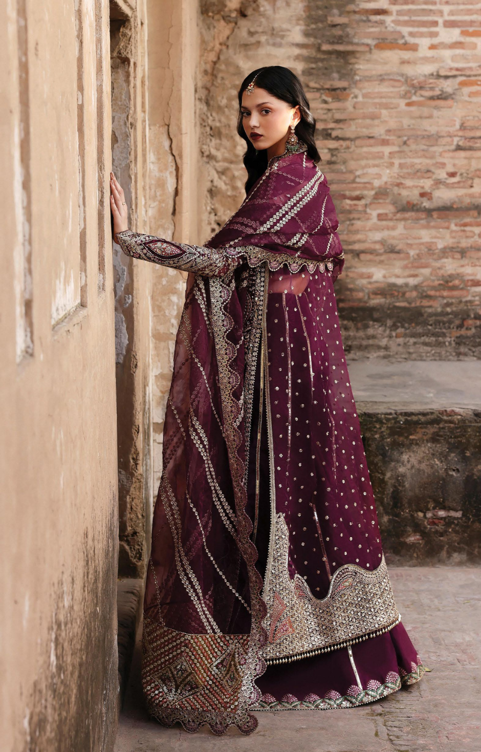 sweeping, heavily worked panels. A sheer, scalloped dupatta drapes fluidly at the side,