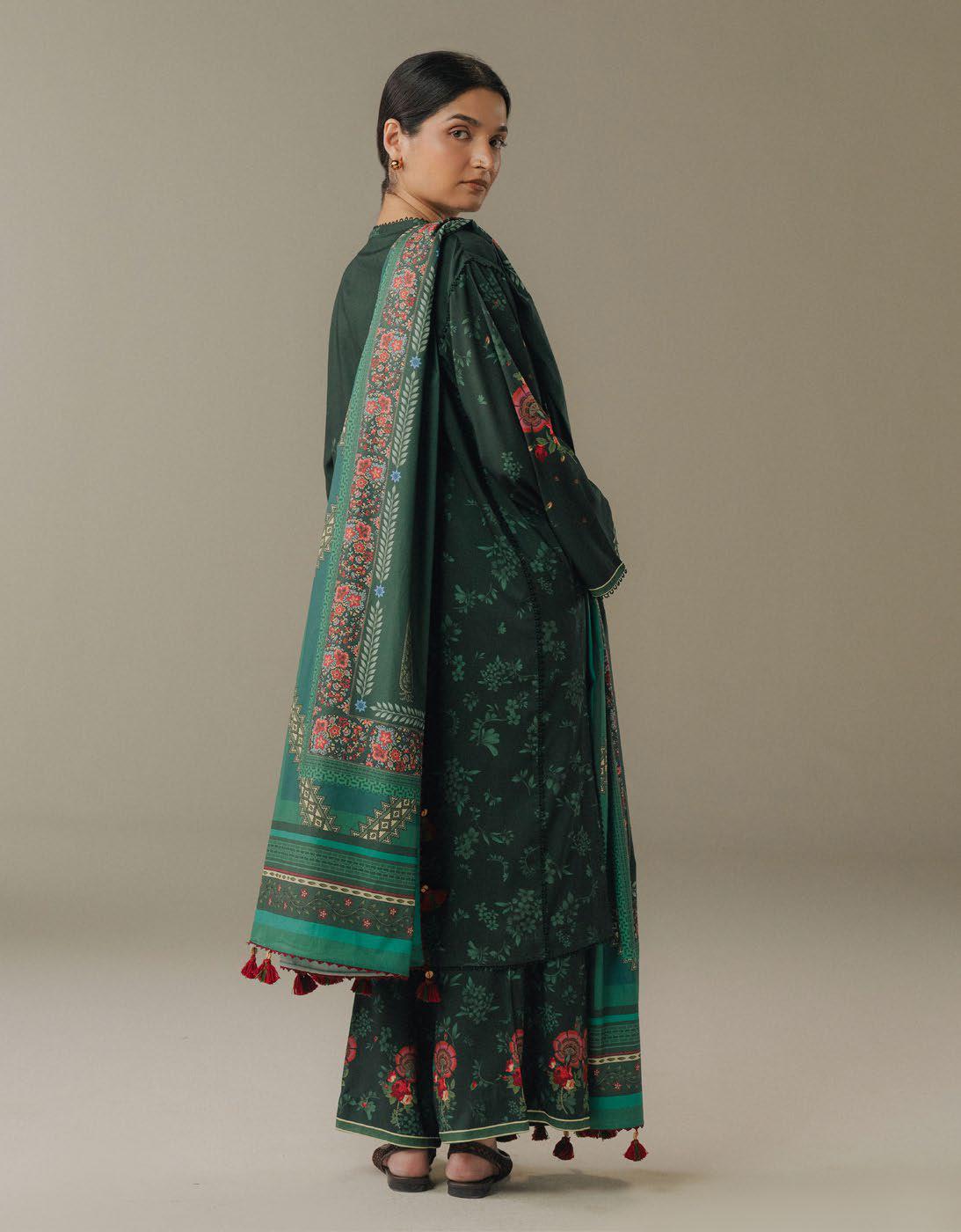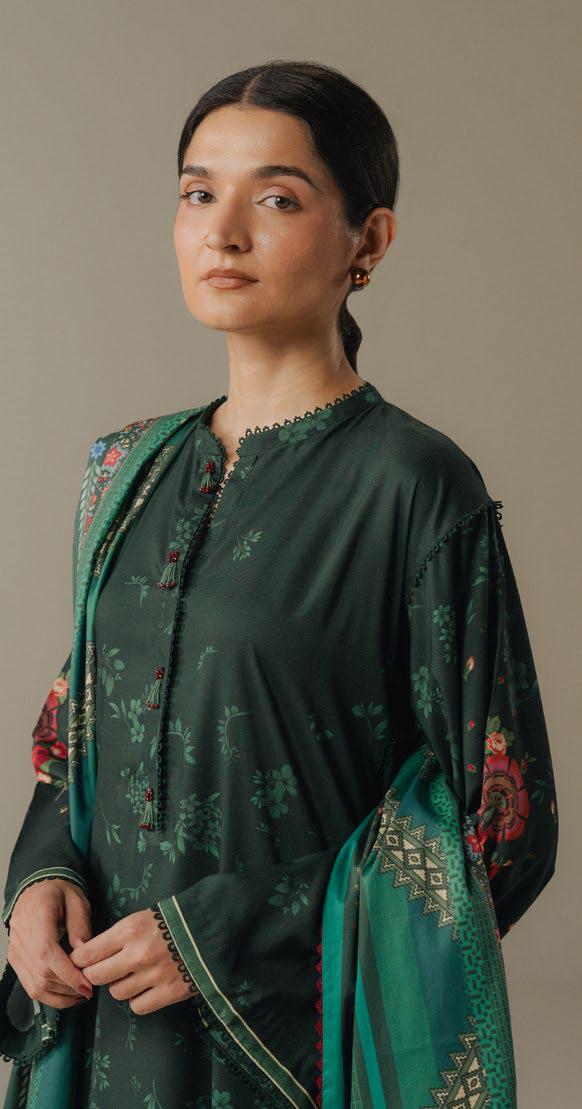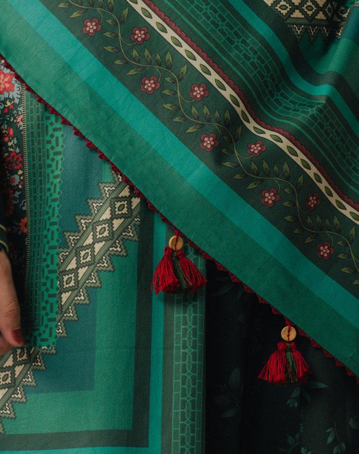 180.00Wild Fern-2A features a forest green shirt and trouser set inspired by lush botanical florals, creating a harmonious, nature-inspired aesthetic. The ensemble is complemented by a teal shawl adorned with matching botanical motifs, adding depth, elegance, and a beautifully cohesive finish to the overall design.